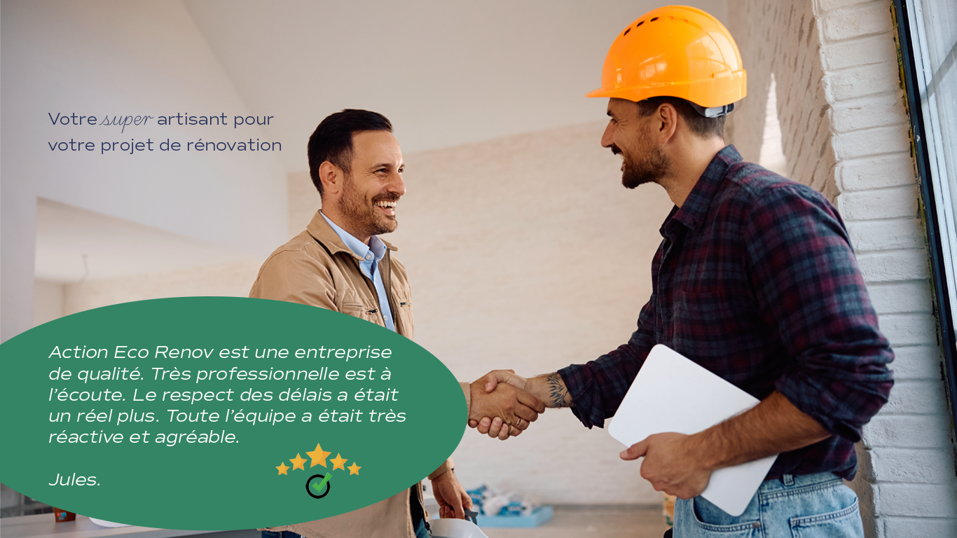 Action Eco Renov vous accompagne jusqu’à la réception finale de votre chantier, garantissant que l’ensemble des travaux s’est déroulé conformément à vos attentes.